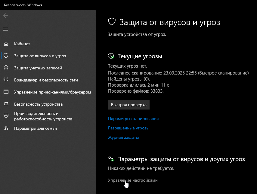- В разделе "Параметры защиты от вирусов и угроз" нажмите "Управление настройками".