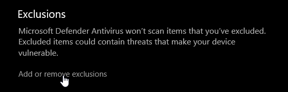 - In category "Exclusions" click "Add or remove exclusions" and click "Yes" to allow Windows Security to modify exclusions.