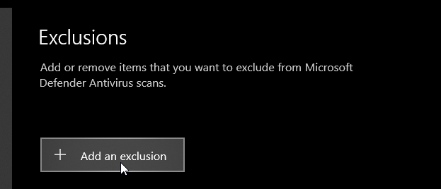 - Click "Add an exclusion" → "Folder" and select the path to the launcher folder.
